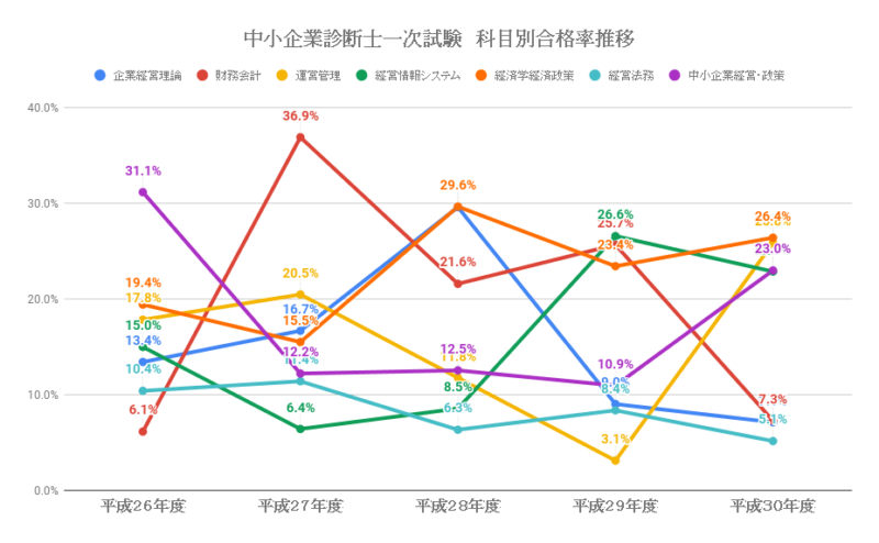 企業経営理論は2017年度に前年度から20%以上合格率を下げて難化していましたが、2018年度も引き続き低合格率に落ち着きました。5年間で合格率20%を超えた年が1回しかなく、難易度の高い科目となっています。